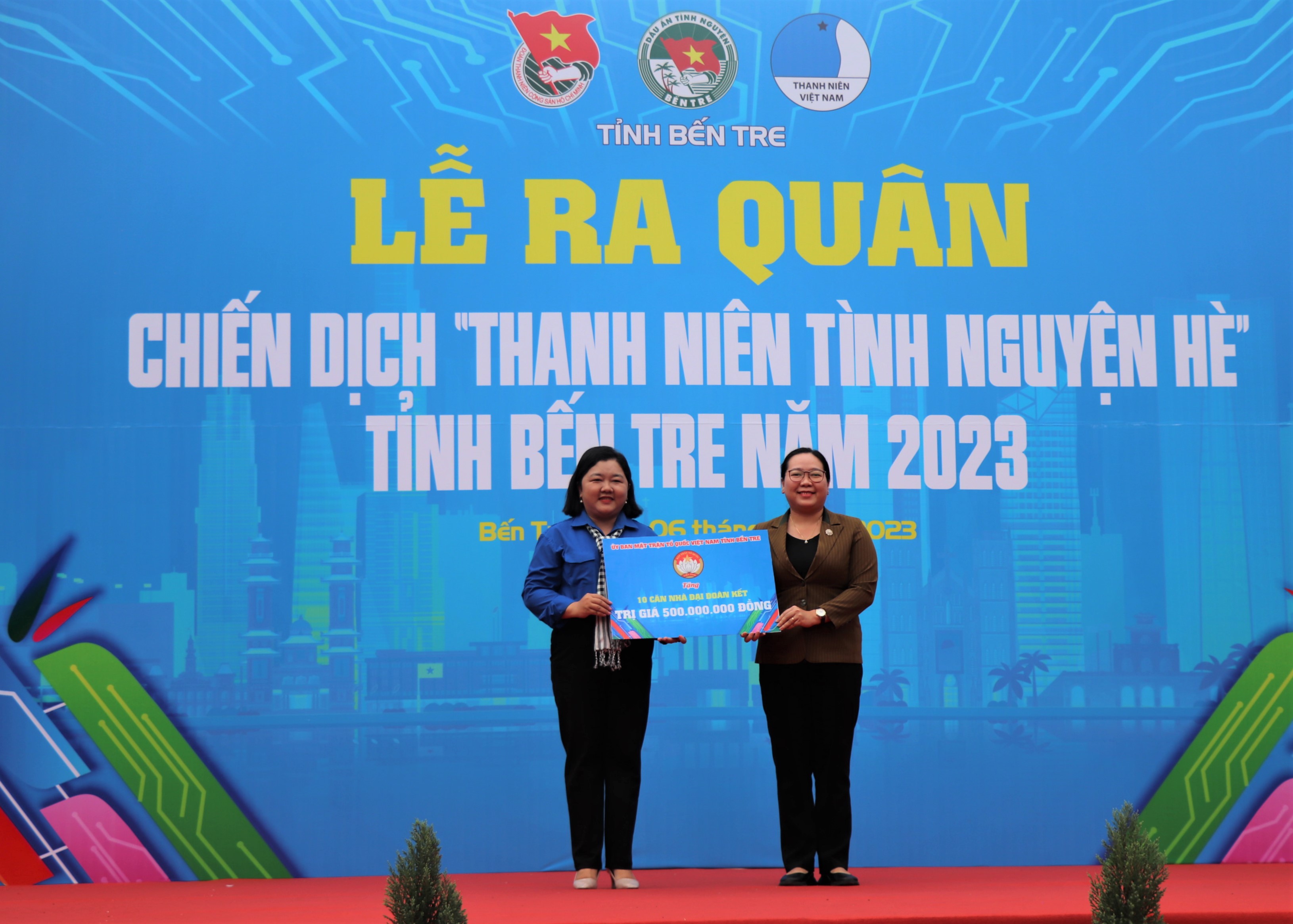 Tại buổi Lễ ra quân Chiến dịch “Thanh niên tình nguyện hè” tỉnh Bến Tre năm 2023, Ban Thường vụ Tỉnh đoàn đã tiếp nhận 500 triệu đồng hỗ trợ kinh phí xây dựng 10 căn nhà Đại đoàn kết từ Ủy ban Mặt trận Tổ quốc Việt Nam tỉnh, tiếp nhận 228.000.000 đồng từ tổ chức Global Vision (Hàn Quốc) tại Việt Nam hỗ trợ kinh phí xây 06 căn nhà tình thương cho các hộ dân có hoàn cảnh khó khăn trên địa bàn huyện Mỏ Cày Bắc và tiếp nhận hỗ trợ từ nguồn lực trên 1,8 tỷ đồng từ các đơn vị tài trợ: Ban Trị sự Giáo hội Phật giáo Việt Nam tỉnh Bến Tre, Ngân hàng Nông nghiệp và phát triển Nông thôn chi nhánh Bến Tre, Hội Doanh nhân Trẻ tỉnh Bến Tre, Ban Giám đốc Trung tâm kinh doanh VNPT Bến Tre, Ban Giám đốc Tập đoàn Viễn thông Quân đội Viettel chi nhánh Bến Tre, Công ty Điện lực tỉnh Bến Tre, Tổng Công ty Du lịch Sài Gòn TNHH MTV (Saigontourist Group), Công ty TNHH Phát triển Sản xuất Thương mại Thuận Thiên, Trường Đại học Bách Khoa - ĐHQG TP.Hồ Chí Minh, Trường Đại học Công nghệ Thông tin - ĐHQG TP.Hồ Chí Minh, Trường Đại học Kinh tế - Luật - ĐHQG TP.Hồ Chí Minh, Trường Đại học Hoa Sen, Câu lạc bộ Hạnh nguyện TP. Hồ Chí Minh, Trường Cao đẳng Bách Khoa Sài Gòn, Đoàn Khối Cơ quan - Doanh nghiệp tỉnh, Ủy ban MTTQ Việt Nam huyện Mỏ Cày Nam, Phòng khám Đa khoa Y Việt Sài Gòn huyện Mỏ Cày Nam 08 căn nhà tình thương, 05 căn nhà Đại đoàn kết, 200 áo, nón chiến dịch, 02 cầu giao thông nông thôn, 2300 bao xi măng, 10 bộ máy vi tính, bê tông hóa 03 tuyến đường, thắp sáng 01 tuyến đường giao thông nông thôn; trao sọt rác phân loại rác, giỏ đi chợ và túi tự hủy, tặng 20 phần quà cho các hộ gia đình có hoàn cảnh khó khăn và 10 phần quà cho các em thiếu nhi trên địa bàn huyện Mỏ Cày Nam.