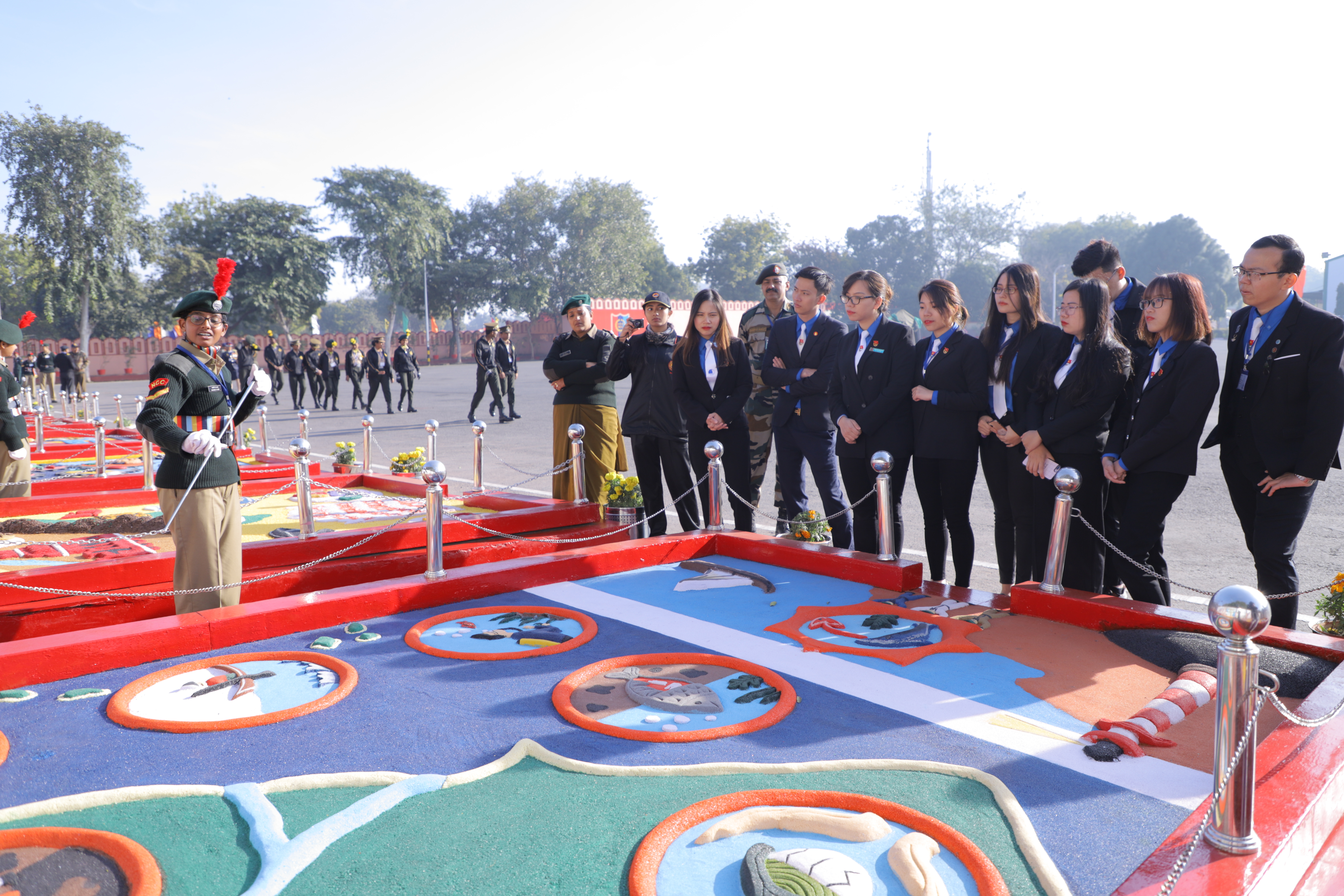 Đoàn đại biểu thanh niên Việt Nam tham quan khu vực trưng bày cờ của các vùng lãnh thổ ở Ấn tại khuôn viên Trại lính NCC