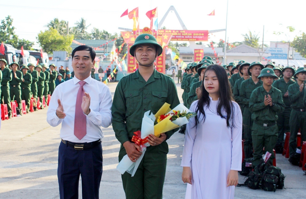 Đồng chí Dương Văn An - Ủy viên Ban Chấp hành Trung ương Đảng, Bí thư Tỉnh ủy, Trưởng đoàn ĐBQH tỉnh Bình Thuận tặng hoa cho các thanh niên lên đường nhập ngũ