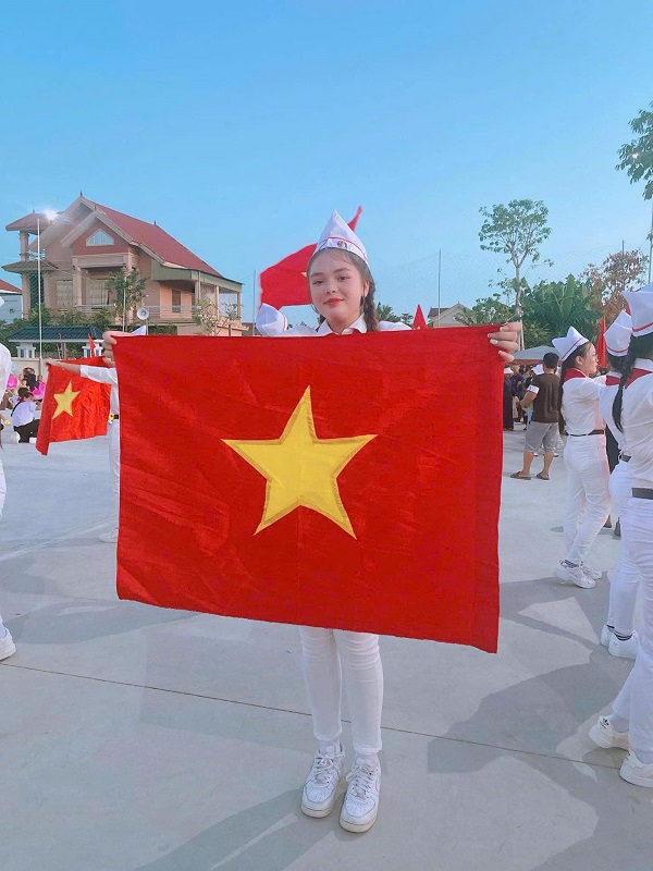 Hình ảnh đặc biệt em gái quốc tịch Đức - Em Kupka Ma-Ri-A, sinh năm 2011 (mẹ người Việt) bên Lá cờ đỏ sao vàng trong quá trình tham gia Ngày hội thiếu nhi năm 2024 tại xã Đô Thành, huyện Yên Thành.