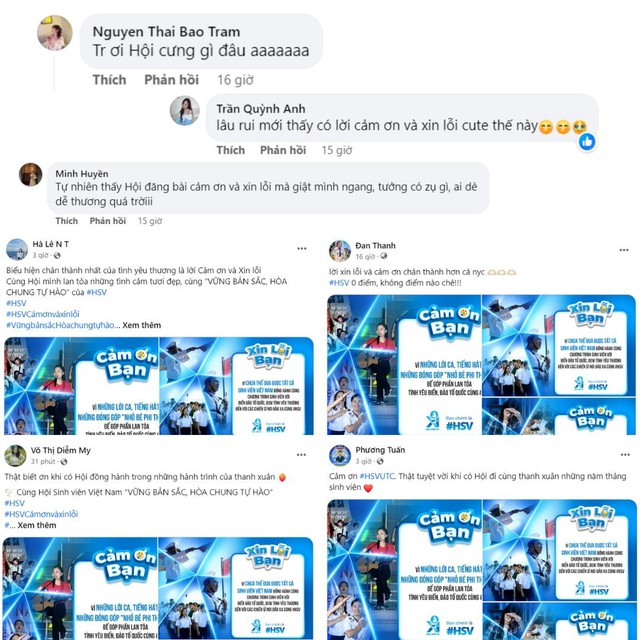Đặc biệt, trên Fanpage của Hội Sinh viên Việt Nam đã nhận được nhiều bình luận sôi nổi, hào hứng của sinh viên trên toàn quốc như: "Lâu rồi mới có lời cảm ơn và xin lỗi cute thế này"; "Tự nhiên thấy Hội đăng bài cảm ơn và xin lỗi mà giật mình, tưởng có vụ gì, ai dè dễ thương quá trời". Có bạn còn hài hước: "Lời xin lỗi và cảm ơn chân thành hơn cả nyc (người yêu cũ - PV), HSV 0 điểm - không điểm nào chê!!!".