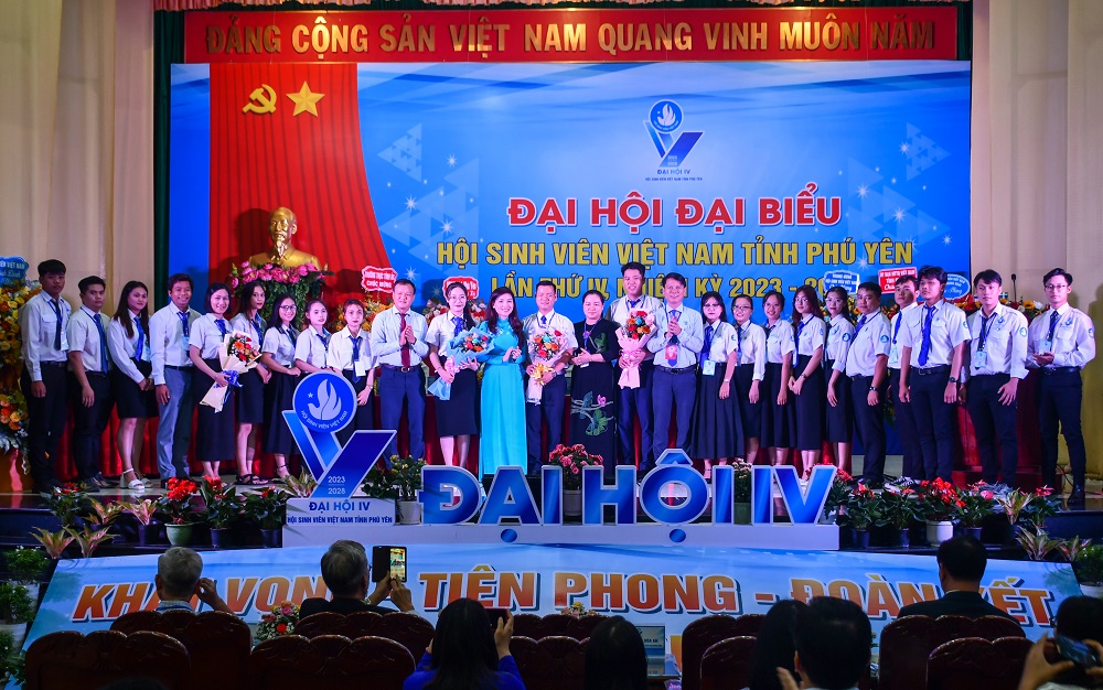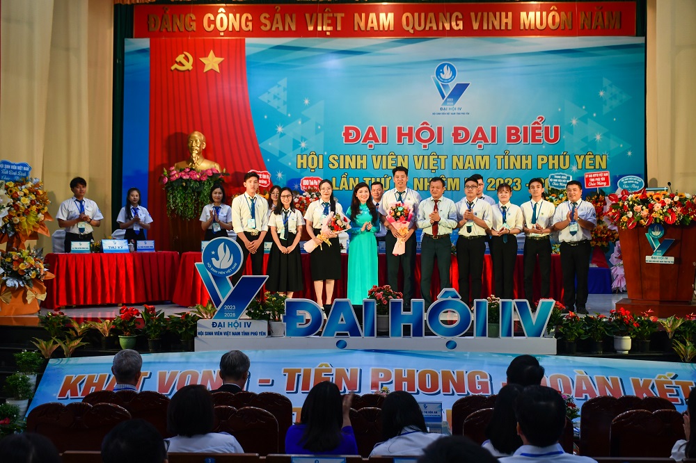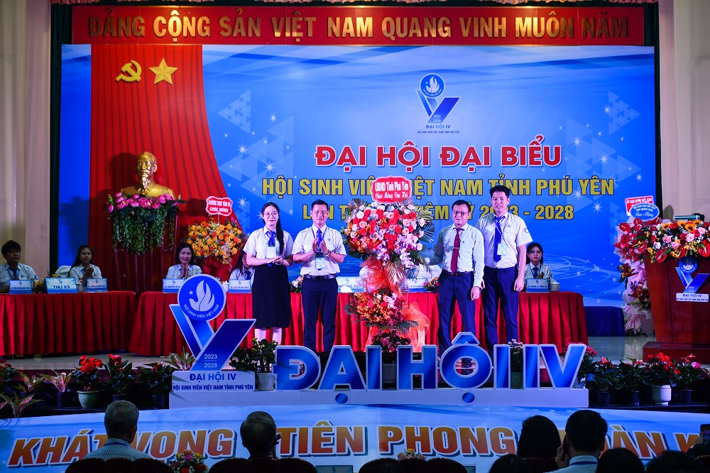 Đồng chí Hồ Hồng Nguyên, Ủy viên BTV Trung ương Đoàn, Trưởng Ban Thanh niên Trường học Trung ương Đoàn, Phó Chủ tịch Thường trực Trung ương Hội Sinh viên Việt Nam và các đồng chí lãnh đạo tỉnh Phú Yên, Thường trực Tỉnh Đoàn tặng hoa chức mừng Ban Chấp hành Hội Sinh viên Việt Nam tỉnh Phú Yên khóa IV.
