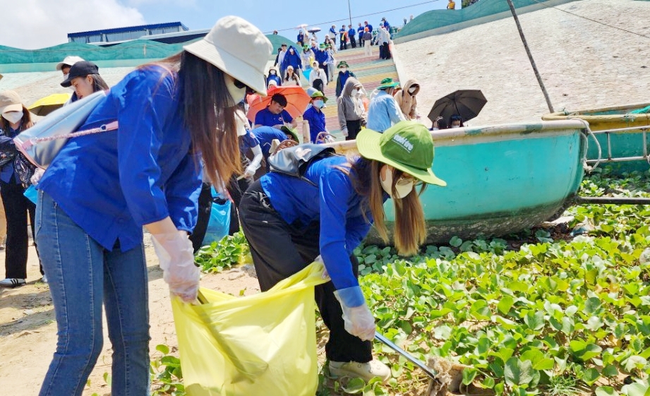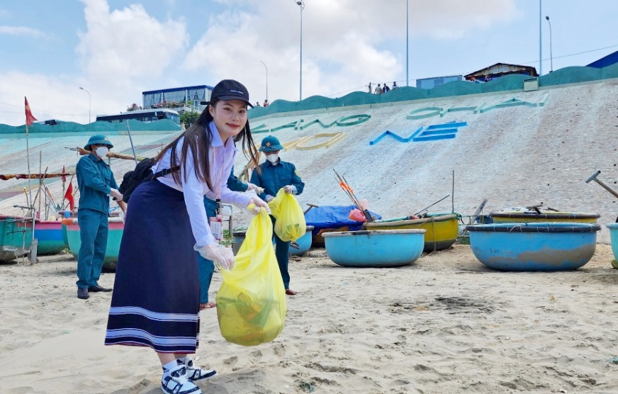 Các bạn sinh viên tham gia dọn rác tại Làng chài Mũi Né