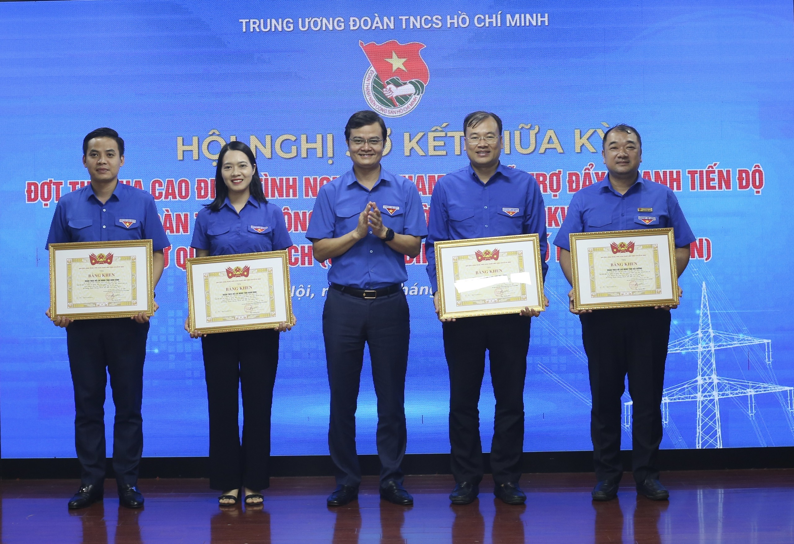 Dịp này, T.Ư Đoàn khen thưởng 4 Tỉnh đoàn gồm Ninh Bình, Thái Bình, Nam Định, Hải Dương hoàn thành 100% khối lượng công việc trong đợt thi đua cao điểm tình nguyện tham gia hỗ trợ đẩy nhanh tiến độ hoàn thành công trình đường dây 500kV mạch 3 đoạn từ Quảng Trạch đến Phố Nối trước ngày 20.6.