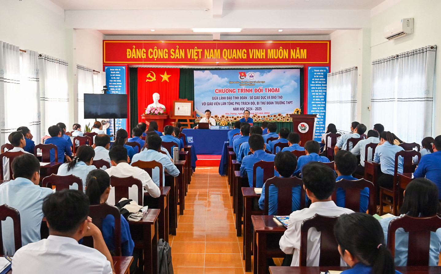 Quang cảnh chương trình đối thoại giữa lãnh đạo Tỉnh đoàn, Sở Giáo dục và Đào tạo Sóc Trăng với giáo viên làm tổng phụ trách đội, bí thư đoàn trường trung học phổ thông năm học 2024 - 2025.