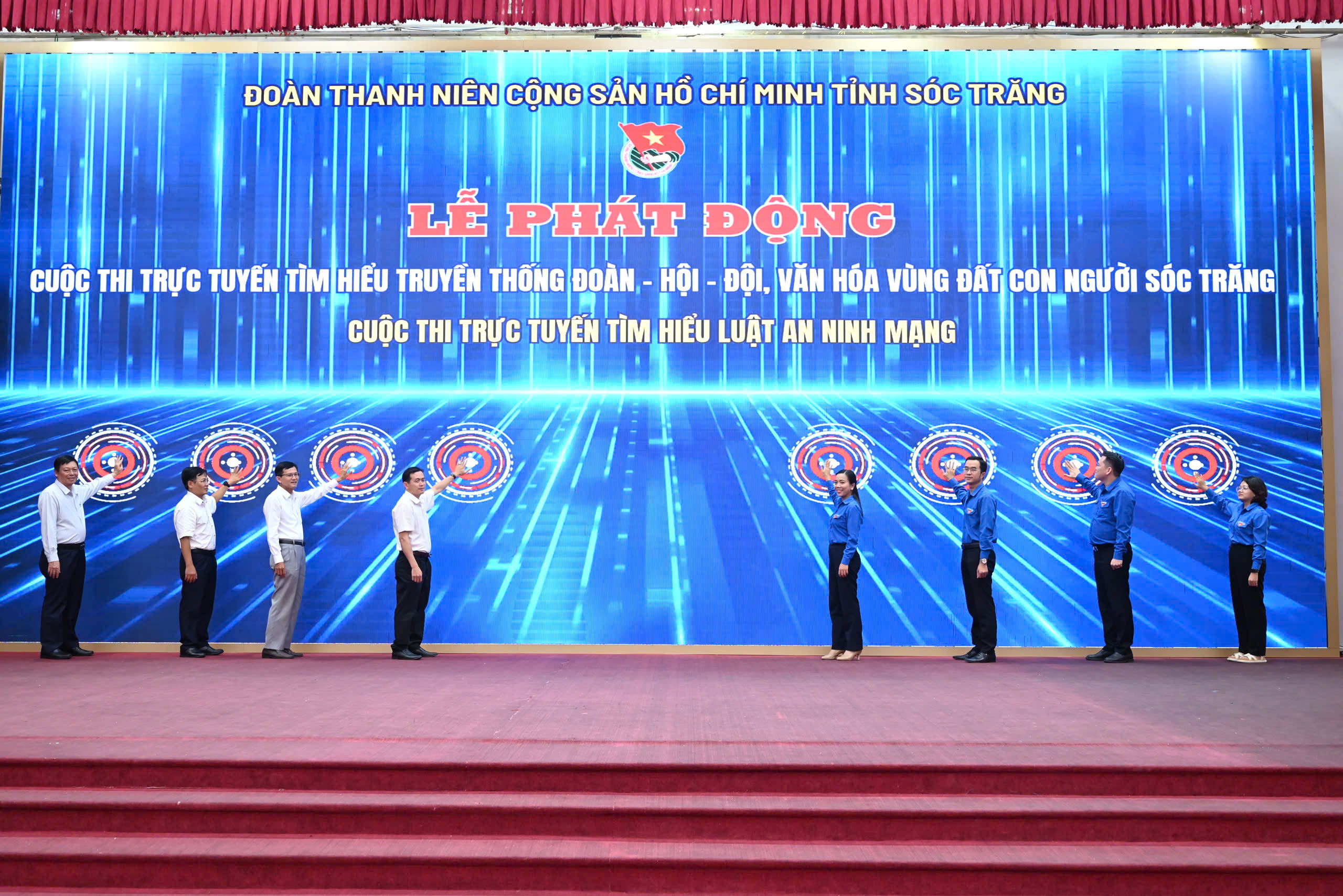Các đồng chí lãnh đạo ấn nút phát động cuộc thi trực tuyến tìm hiểu “Truyền thống Đoàn - Hội - Đội và Văn hóa vùng đất, con người Sóc Trăng” và cuộc thi trực tuyến tìm hiểu Luật An ninh mạng