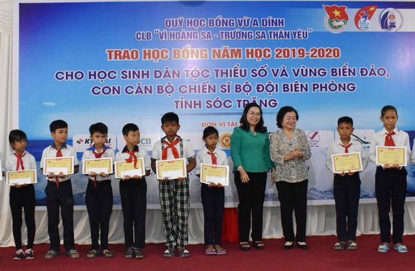 Các em học sinh được nhận học bổng ở 3 cấp học: Tiểu học, THCS và THPT, trong đó, 80 suất dành cho học sinh con em đồng bào dân tộc thiểu số, 50 suất dành cho con em ngư dân và 20 suất dành cho con cán bộ, chiến sĩ biên phòng với tổng số tiền 150 triệu đồng từ nguồn Quỹ học bổng Vừ A Dính và Câu lạc bộ “Vì Hoàng Sa - Trường Sa thân yêu” do Nguyên Phó Chủ tịch nước Trương Mỹ Hoa làm Chủ tịch quỹ và Chủ nhiệm Câu lạc bộ.