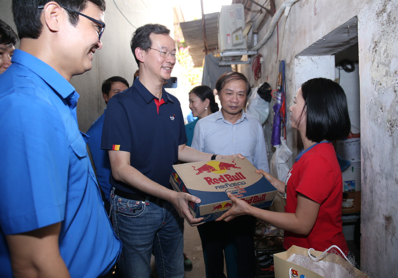 Ông Saravoot Yoovidhya, CEO Tập đoàn TCP trao biển tượng trưng 200 thùng sản phẩm cho thanh niên công nhân trên địa bàn thành phố Hà Nội