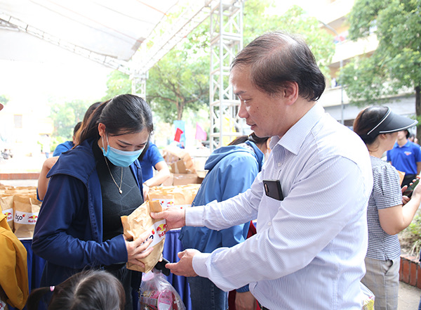 Đồng chí Phạm Tất Thắng, Uỷ viên BCH Trung ương Đảng, Phó Trưởng ban Thường trực Ban Dân vận Trung ương và đồng chí Bùi Quang Huy, Ủy viên dự khuyết BCH Trung ương Đảng, Bí thư thứ nhất Trung ương Đoàn trao quà cho thanh niên công nhân có hoàn cảnh khó khăn trên địa bàn.
