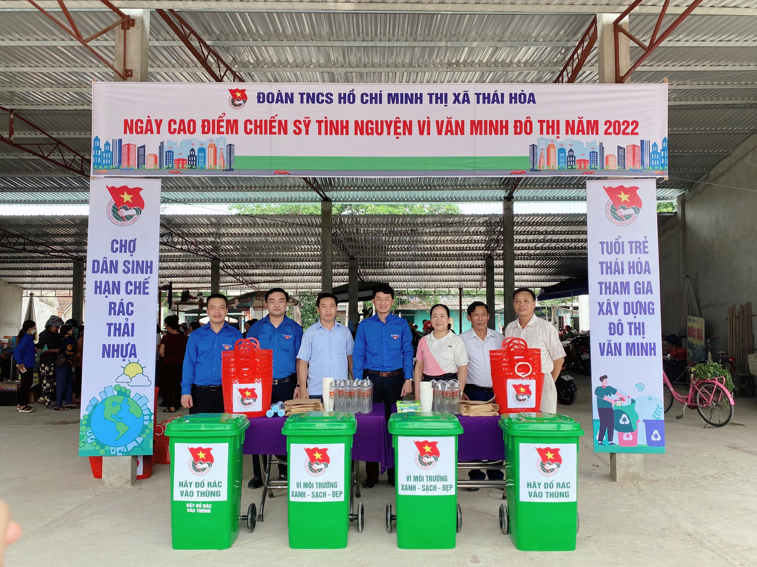 Đồng chí Trần Linh – Phó Bí thư Tỉnh đoàn thăm mô hình chợ dân sinh giảm thiểu rác thải nhựa tại phường Quang Phong, Thị xã Thái Hoà
