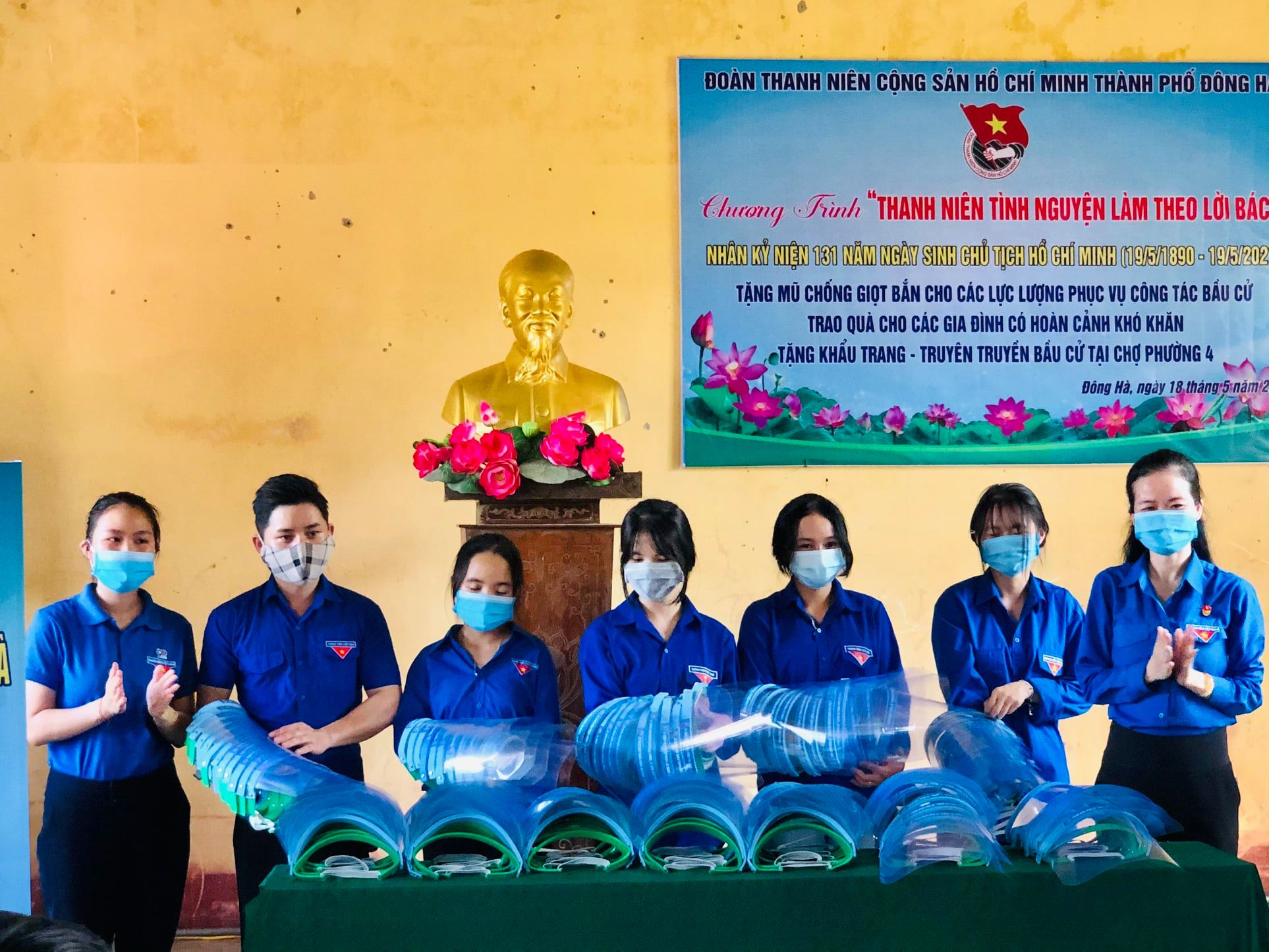 Theo đó, các cấp bộ Đoàn trong toàn tỉnh Quảng Trị đẩy mạnh công tác tuyên truyền về cuộc đời, thân thế, sự nghiệp cách mạng vẻ vang của Chủ tịch Hồ Chí Minh vĩ đại; giới thiệu các ấn phẩm, bài viết, lời dạy của Bác; các cơ sở Đoàn đã thực hiện các công trình, phần việc hưởng ứng tuần lễ “Thanh niên làm theo lời Bác” tiêu biểu như: Thành Đoàn Đông Hà tổ chức chương trình “Thanh niên làm theo lời Bác” trao tặng mũ chống giọt bắn cho các lực lượng phục vụ công tác bầu cử, tặng quà cho các gia đình có hoàn cảnh khó khăn, tặng khẩu trang và tuyên truyền bầu cử tại chợ Phường 4, thành phố Đông Hà.