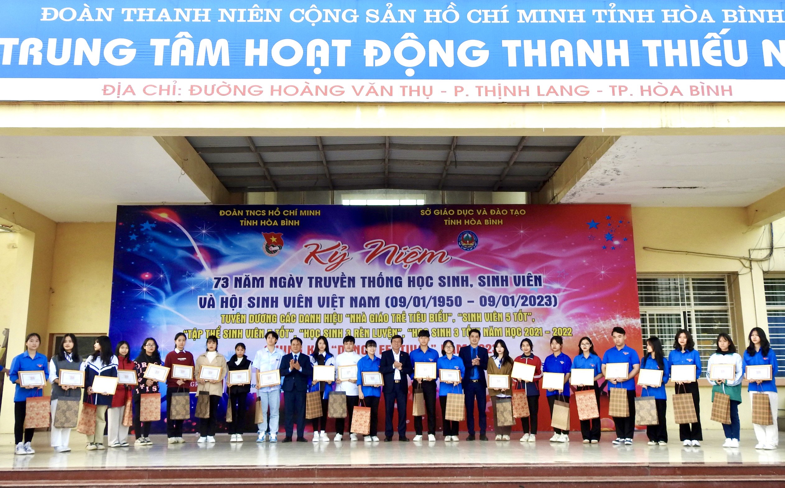 Cũng tại chương trình, Ban Thường vụ Tỉnh đoàn đã tuyên dương. trao giấy chứng nhận và tặng thưởng cho 12 giáo viên trẻ đạt danh hiệu “Nhà giáo trẻ tiêu biểu” cấp tỉnh năm 2022; 09 sinh viên đạt danh hiệu “Sinh viên 5 tốt”; 06 học sinh đạt danh hiệu “Học sinh 3 rèn luyện”; 27 học sinh đạt danh hiệu “Học sinh 3 tốt”, công nhận 03 tập thể đạt danh hiệu “Tập thể sinh viên 5 tốt” cấp tỉnh trong năm học vừa qua. Ban tổ chức chương trình, Ngân hàng Công thương Việt Nam chi nhánh Hoà Bình, Công ty JA Việt Nam đã tặng thưởng tiền mặt và quà tặng 54 cá nhân và 03 tập thể được tuyên dương khen thưởng, mỗi phần quà trị giá 500.000đ. Tổng trị giá phần thưởng trao tặng tại chương trình là 28,5 triệu đồng.