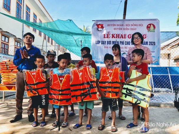 Huyện đoàn Diễn Châu tổ chức khai giảng lớp học bơi phòng, chống đuối nước và tặng áo phao cho 21 em học sinh tại xã Diễn Nguyên