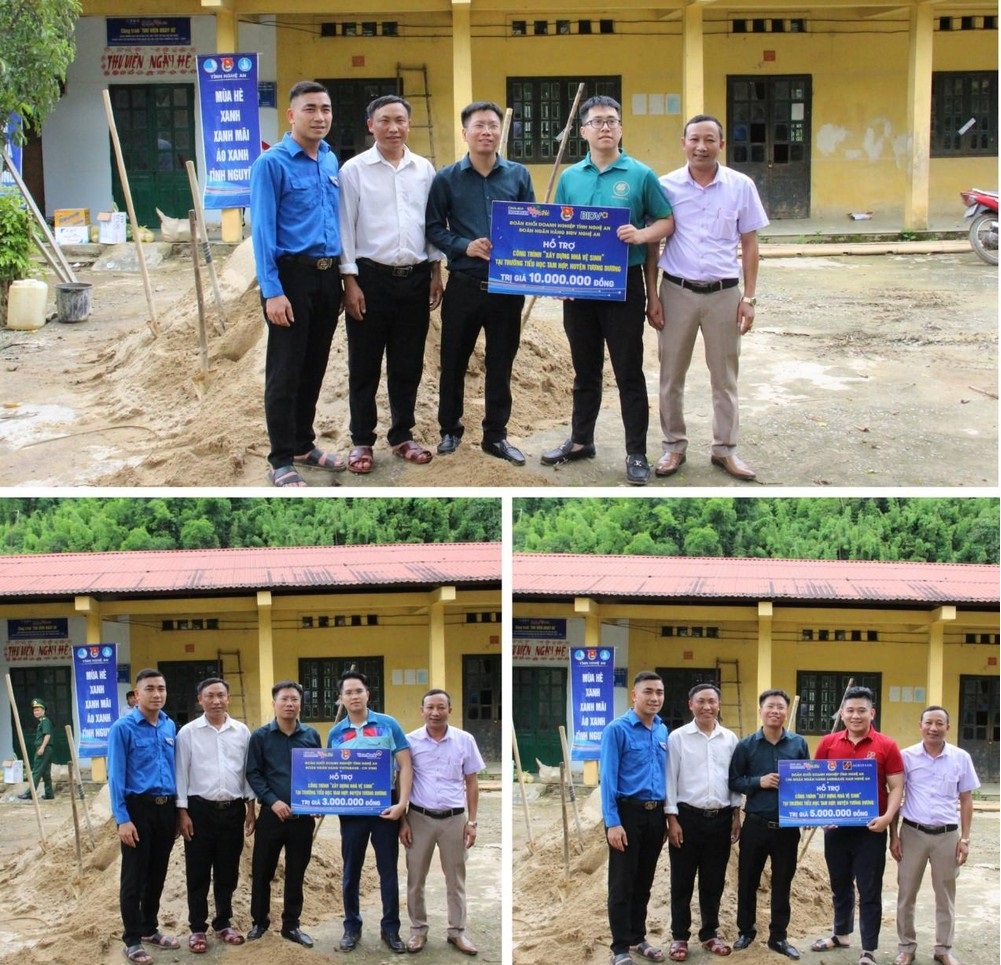 Đại diện các các cơ sở Đoàn thuộc Đoàn Khối Doanh nghiệp tỉnh (gồm cơ sở đoàn Ngân hàng Vietinbank, ngân hàng BIDV, ngân hàng Agribank) trao biển hỗ trợ kinh phí cho Trường Tiểu học Tam Hợp điểm trường bản Huồi Sơn.