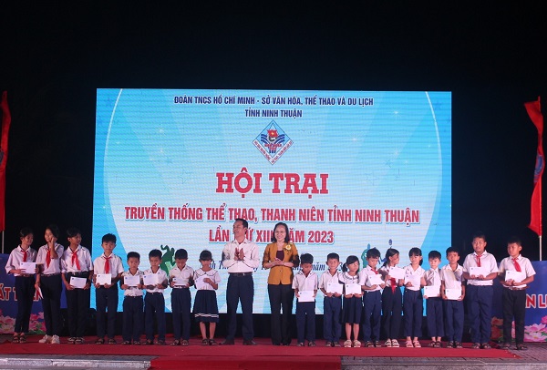 Trong chương trình, Ban Tổ chức Hội trại trao tặng cho thành Đoàn Phan Rang – Tháp Chàm: 40 suất học bổng “Thắp sáng ước mơ” cho các em học sinh dân tộc thiểu số vượt khó, học giỏi trị giá 40 triệu đồng; 20 triệu đồng xây dựng khu vui chơi cho thiếu nhi; 1.000 quyển vở cho thiếu nhi phục vụ học tập; Câu Lạc bộ cựu cán bộ Đoàn tỉnh trao tặng thành Đoàn Phan Rang- Tháp Chàm và Huyện Đoàn Ninh Hải, mỗi đơn vị 01 Thư viện sách và 10 suất học bổng cho thiếu nhi có hoàn cảnh khó khăn; đặc biệt, lãnh đạo tỉnh và lãnh đạo thành phố Phan Rang- Tháp Chàm đã đến thăm, tặng quà động viên cho Ban chỉ huy Hội trại và 12 đơn vị trại.