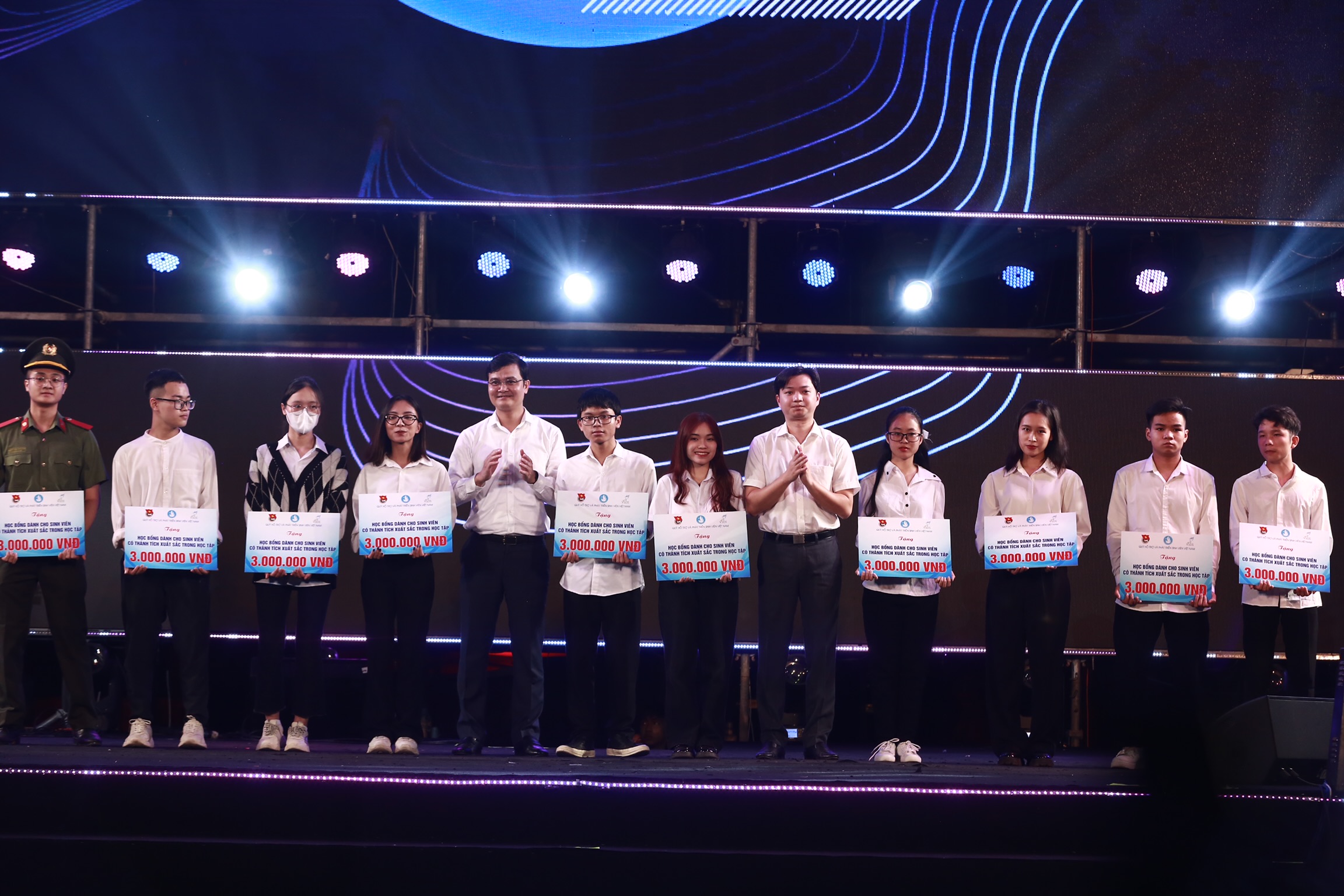 Đồng chí Bùi Quang Huy, Bí thư thứ nhất Trung ương Đoàn và đồng chí Nguyễn Minh Triết, Bí thư Trung ương Đoàn, Chủ tịch Hội Sinh viên Việt Nam trao học bổng cho các học sinh có thành tích xuất sắc trong học tập