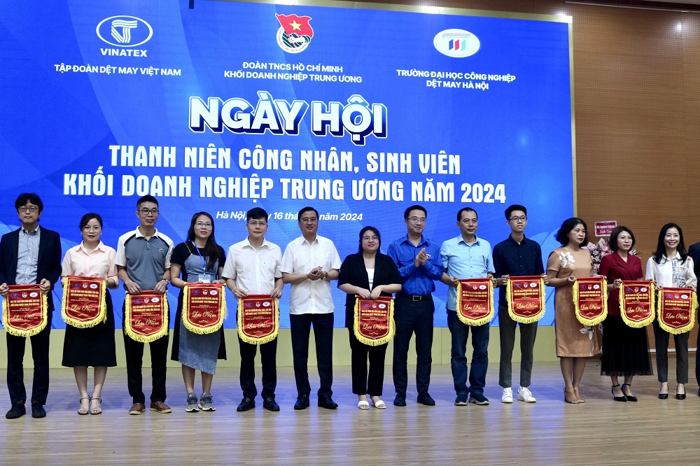 Bí thư Đoàn Khối Doanh nghiệp T.Ư Hoàng Thị Minh Thu và Hiệu trưởng Trường Đại học Công nghiệp Dệt may Hà Nội Hoàng Xuân Hiệp tặng cờ lưu niệm cho các doanh nghiệp