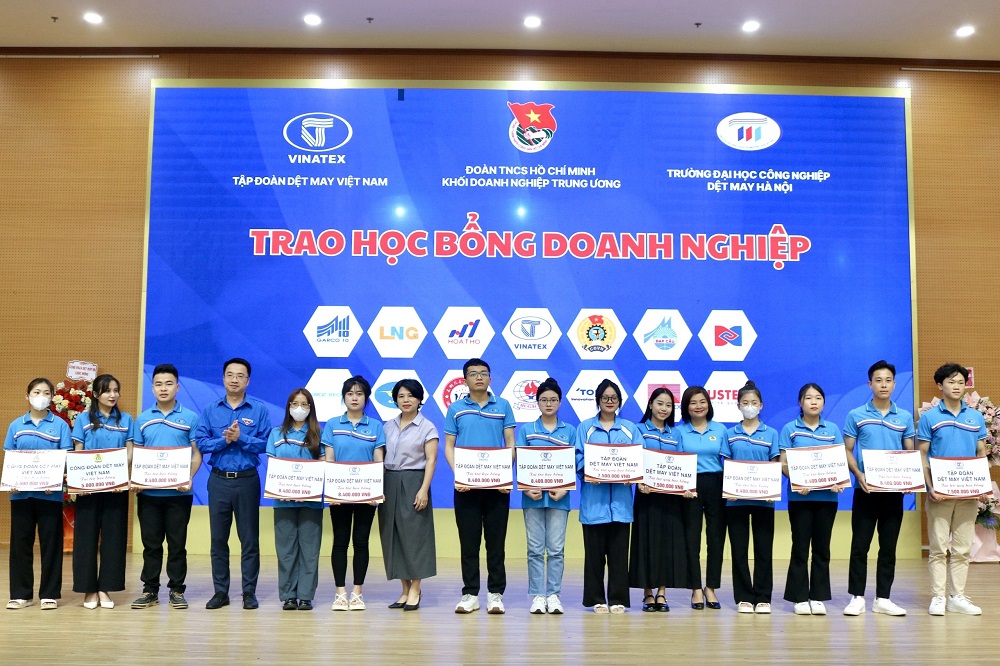 Bí thư T.Ư Đoàn Nguyễn Tường Lâm và Chủ tịch Công đoàn Dệt may Việt Nam Phạm Thị Thanh Tâm trao học bổng cho các em sinh viên