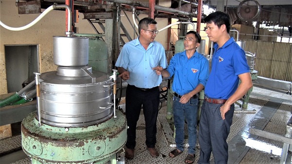 Anh Trần Duy Hùng ( Giữa) đang giới thiệu về hiệu quả của sáng kiến của mình tại xí nghiệp chế biến vận tải cao su ChưPrông