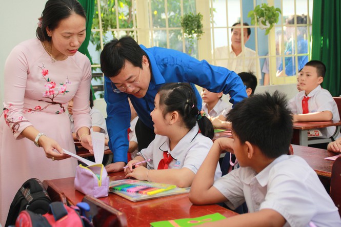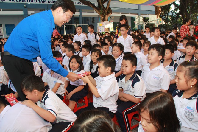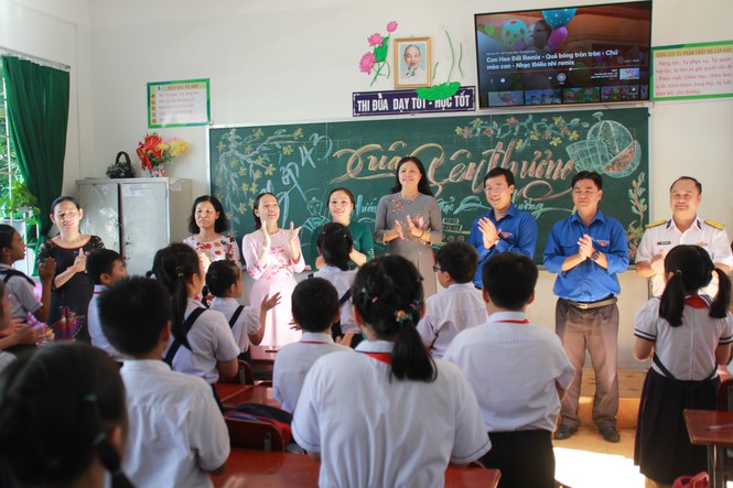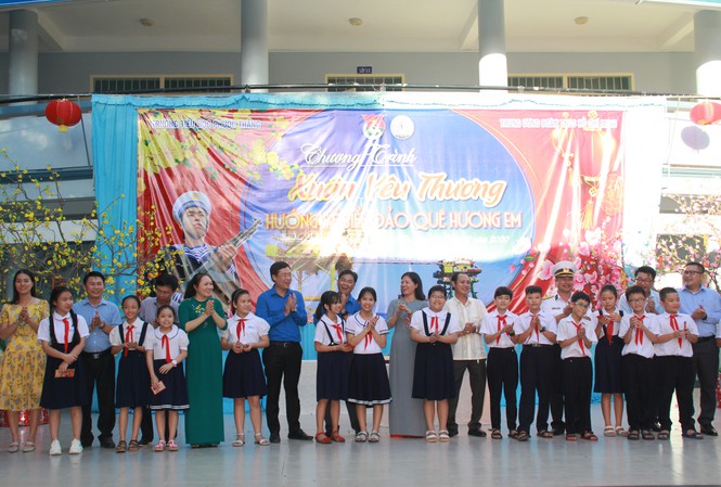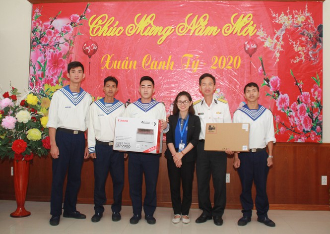 Tại đây, đoàn công tác T.Ư Đoàn, Tỉnh Đoàn Bà Rịa – Vũng Tàu, đại diện đơn vị đồng hành đã trao tặng 20 suất học bổng Vừ A Dính cho 20 con em cán bộ, chiến sỹ Hải quân; tặng bộ thiết bị y tế; tặng quà và lì xì đầu xuân đến toàn thể hơn 1.830 học sinh và cán bộ, giáo viên, nhân viên nhà trường. Dịp này, các em học sinh nhà trường cũng gửi tặng các chiến sỹ đang công tác ở các đơn vị thuộc Vùng 2 Hải quân, Nhà giàn DK1 những bức tranh, tấm thiệp xuân chứa đựng tình cảm mến thương của quân và dân nơi đất liền.