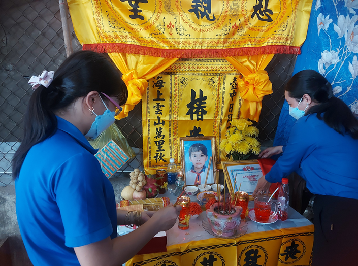 Đại diện Tỉnh đoàn, Hội đồng Đội tỉnh Vĩnh Long đến viếng em Đoàn Minh Quân và động viên, chia sẻ với gia đình em