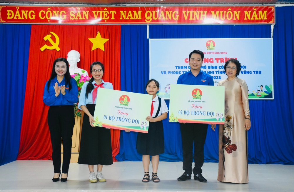 Cũng nhân dịp này, Hội đồng Đội Trung ương cũng trao tặng 03 bộ trống Đội cho Hội đồng Đội huyện Long Điền và Trường Tiểu học Cao Văn Ngọc.