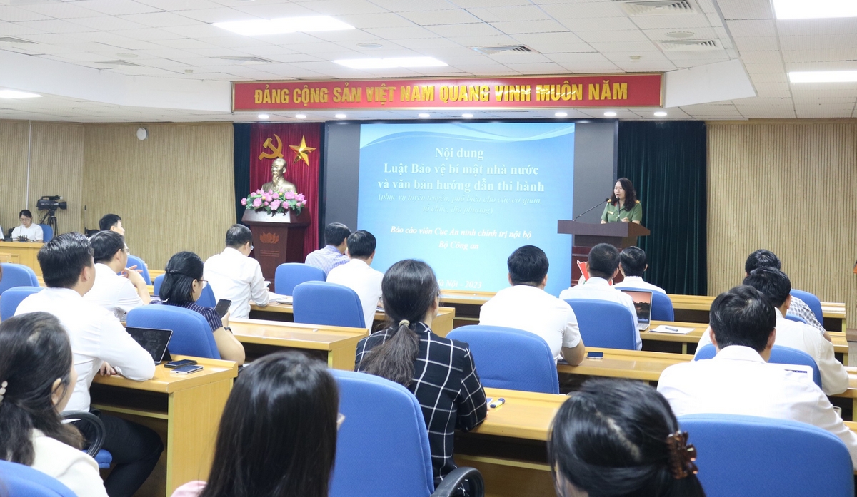 Thượng tá Đặng Thị Hồng Nhung, Phó Trưởng phòng Quản lý nhà nước về bảo vệ bí mật nhà nước, Cục An ninh chính trị nội bộ, Bộ Công an trình bày chuyên đề