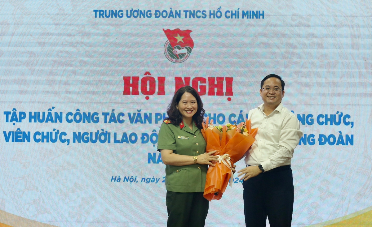 Đồng chí Nguyễn Quốc Huy - Ủy viên Ban Thường vụ, Chánh Văn phòng T.Ư Đoàn tặng hoa cảm ơn Báo cáo viên