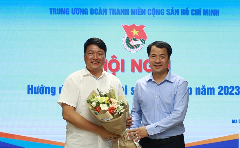 Bí thư T.Ư Đoàn Ngô Văn Cương tặng hoa cảm ơn đồng chí Ngô Mạnh Hùng, Phó Cục Trưởng cục Phòng, chống Tham nhũng, Thanh tra Chính phủ.