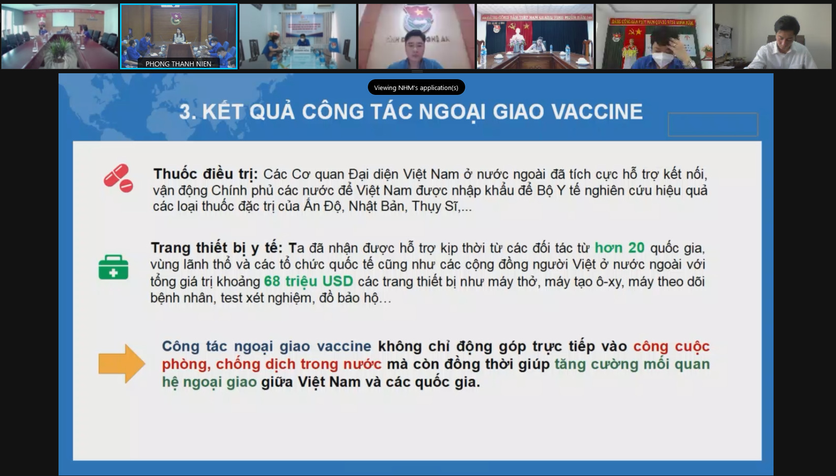 Tại Hội nghị, đồng chí Nguyễn Minh Hằng, Trợ lý Bộ trưởng, Vụ trưởng Vụ Tổng hợp Kinh tế, Bộ Ngoại giao, thành viên tổ công tác về ngoại giao vắc-xin của Việt Nam đã báo cáo chuyên đề về “Ngoại giao vắc xin của Việt Nam”.