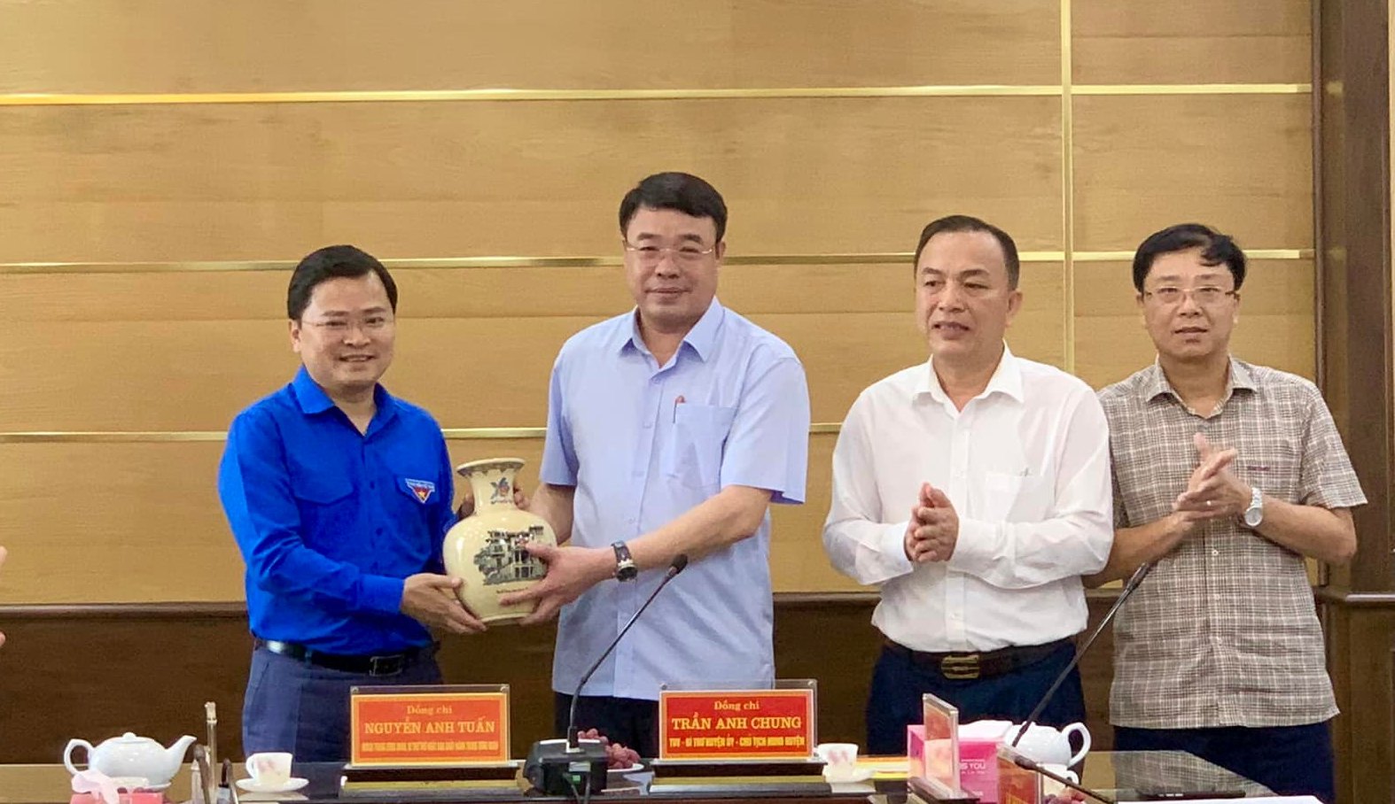 Đồng chí Nguyễn Anh Tuấn tặng quà lưu niệm cho lãnh đạo huyện ủy Quảng Xương