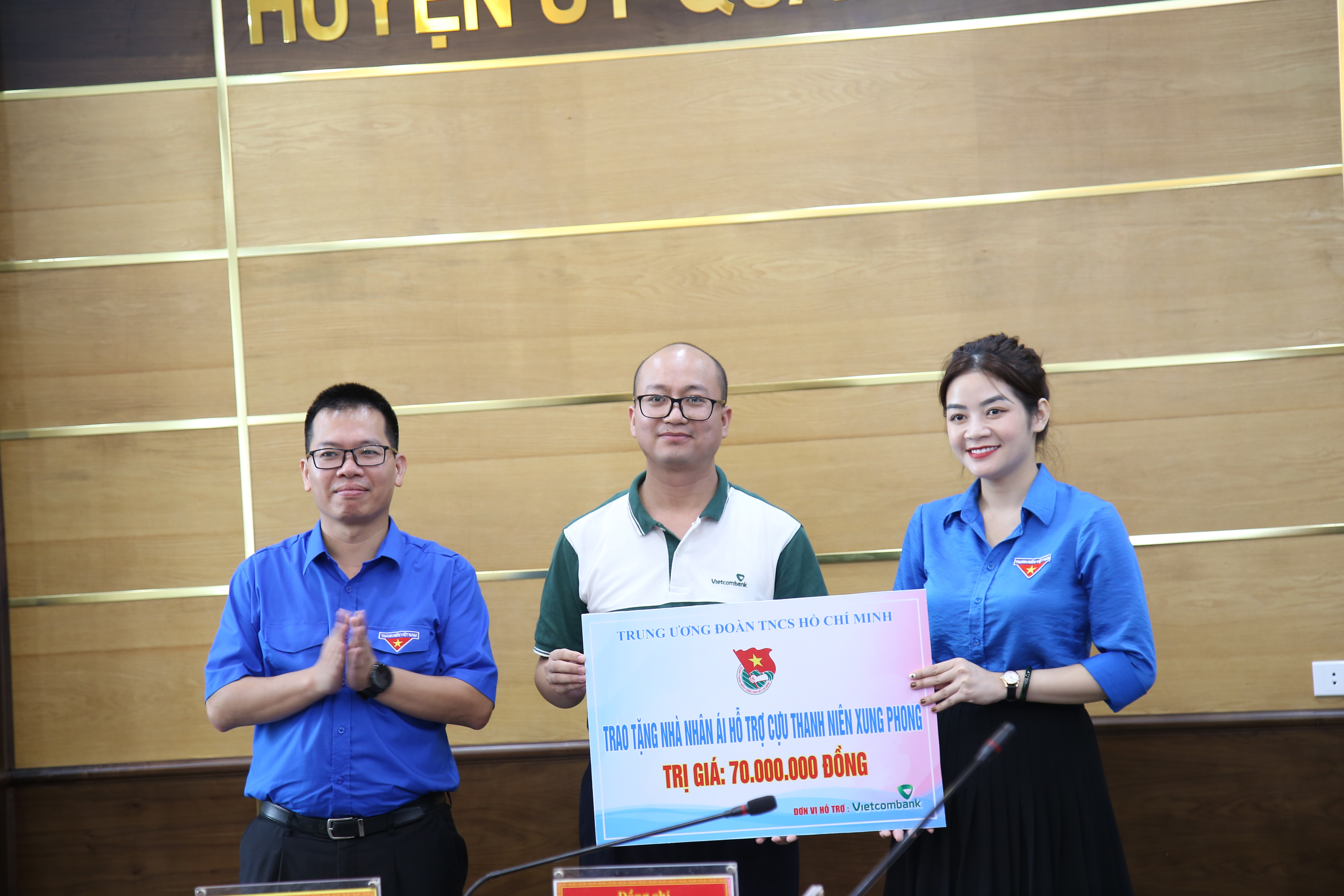 Đồng chí Lê Thanh Tú- Trưởng Ban Thanh niên Xung phong Trung ương Đoàn và Bí thư Đoàn thanh niên Vietcombank Dương Bảo Trung trao tặng nhà nhân ái cho Cựu TNXP trên địa bàn huyện Quảng Xương trị giá 70 triệu đồng