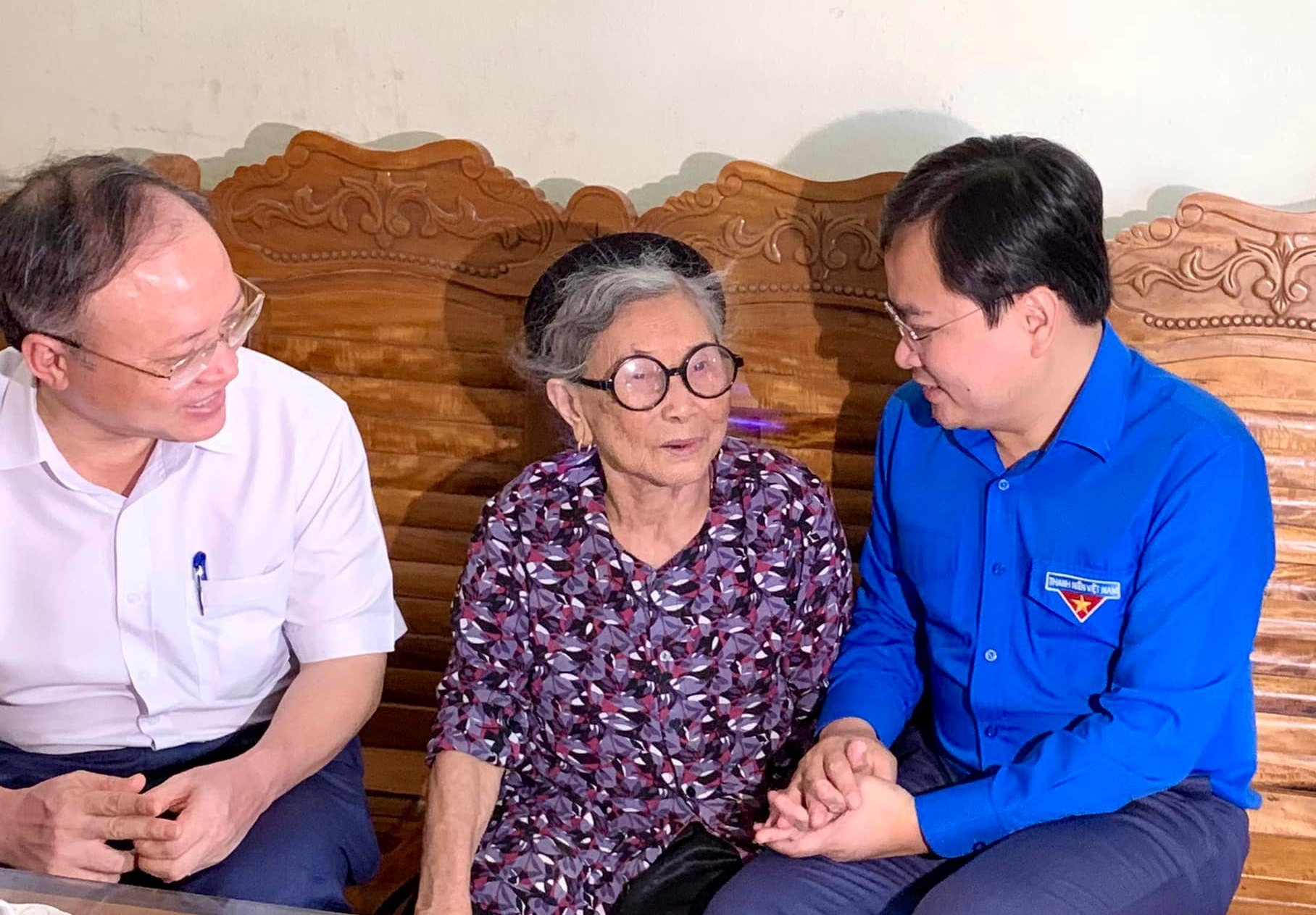 Đồng chí Nguyễn Anh Tuấn - Bí thư thứ nhất T.Ư Đoàn ân cần thăm hỏi Mẹ VNAH Lê Thị Thêm, thôn Đoàn Kết, xã Đông Thịnh, huyện Đồng Sơn