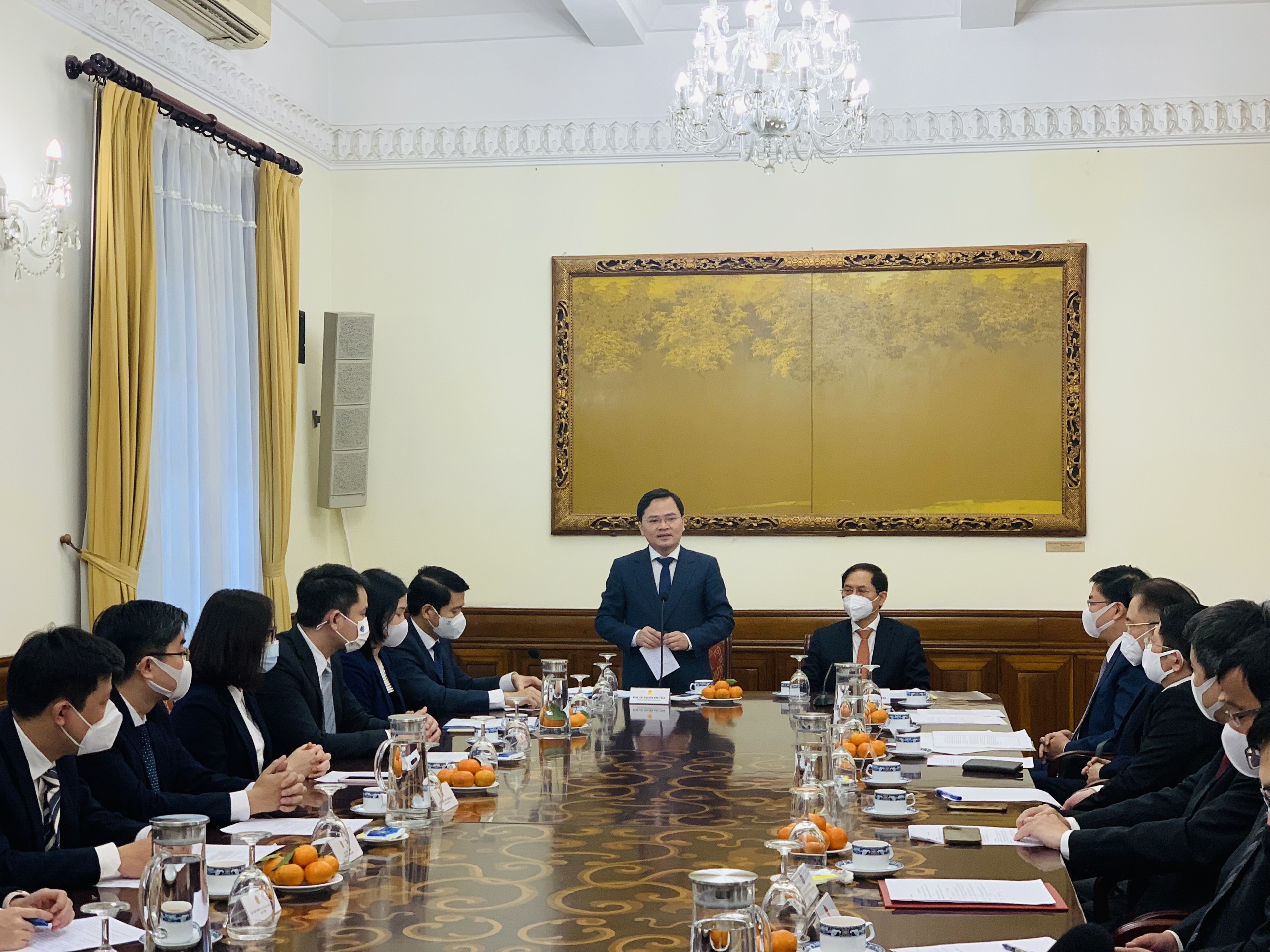 Tán thành với nhận định của Bộ trưởng Bùi Thanh Sơn, Bí thư thứ nhất Trung ương Đoàn Nguyễn Anh Tuấn cho rằng, các đơn vị chức năng của hai bên đã xây dựng chương trình phối hợp bám sát công việc hai bên, chủ trương của Đảng và Nhà nước cũng như tình hình, điều kiện thực tiễn. Bên cạnh đó, đồng chí Nguyễn Anh Tuấn đánh giá cao sự đóng góp của Bộ trưởng Bùi Thanh Sơn, tập thể lãnh đạo, cán bộ Bộ Ngoại giao trong những năm qua, đặc biệt là trong năm 2021 mặc dù tình hình thế giới và khu vực, dịch bệnh tiếp tục có những diễn biến phức tạp. Những đóng góp của Bộ Ngoại giao đã được cộng đồng trong và ngoài nước đánh giá cao như hoạt động Ngoại giao Vắc xin của Việt Nam.