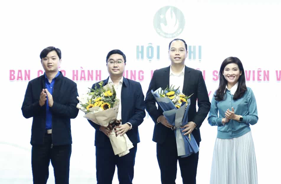 Đồng chí Nguyễn Minh Triết, Bí thư TƯ Đoàn, Chủ tịch TƯ Hội sinh viên Việt Nam ( bìa trái) và đồng chí Hồ Hồng Nguyên, Phó Chủ tịch thường trực TƯ Hội sinh viên Việt Nam tặng hoa chúc mừng 2 đồng chí Tân Phó Chủ tịch