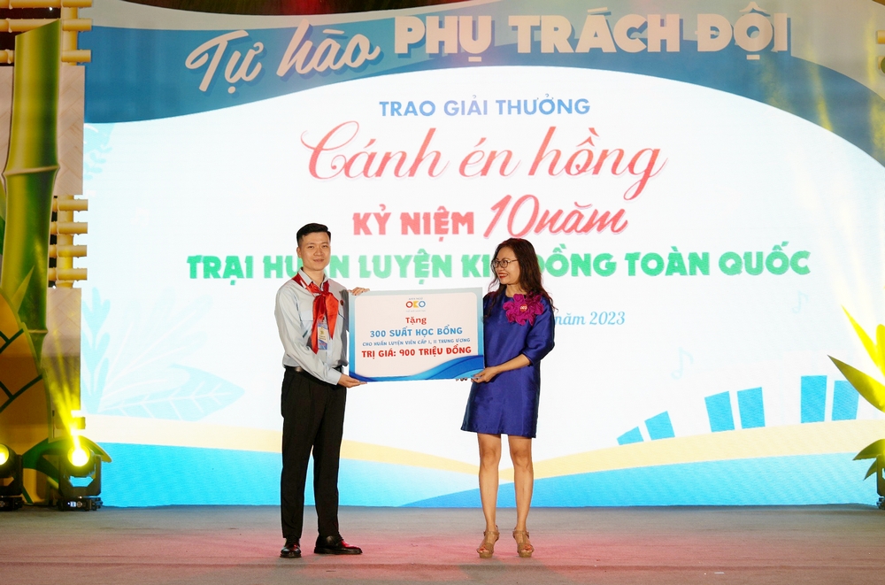 Bên cạnh sân chơi cho các em thiếu niên, Hội đồng Đội Trung ương và Anh ngữ OKO cũng mong muốn giúp đội ngũ cán bộ phụ trách Đội các cấp nâng cao ngoại ngữ, tự tin giao tiếp quốc tế và tiếp cận văn hóa toàn cầu. Do đó, tại Trại Huấn luyện Kim Đồng toàn quốc năm 2023, bà Phan Thị Bích Hà, Chủ tịch Anh ngữ OKO, đại diện Ban tổ chức sân chơi “Thiếu niên Việt Nam - Công dân toàn cầu” đã trao tặng 300 suất học bổng tiếng Anh (mỗi suất trị giá 3 triệu đồng) cho các Huấn luyện viên cấp I, II Trung ương.