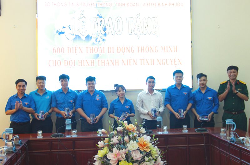 Bí thư Tỉnh Đoàn Bình Phước Trần Quốc Duy (bên trái, ngoài cùng) và Giám đốc Viettel Bình Phước Chu Hồng Quảng trao tặng điện thoại di động thông minh cho các tình nguyện viên