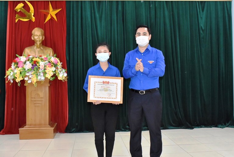 Đồng chí Lê Thành Đông trao tặng bằng khen của BCH Tỉnh đoàn và quà cho em Bùi Thị Mỹ Dung