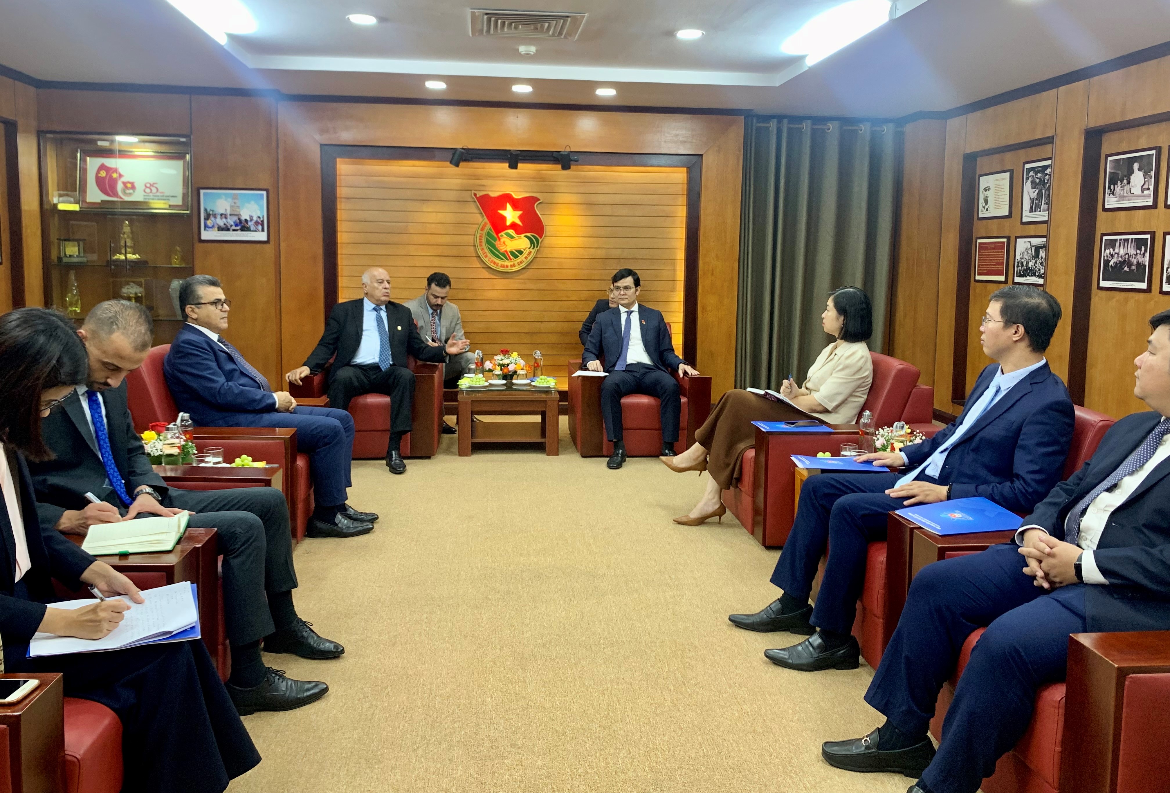 Bí thư thứ nhất Trung ương Đoàn Bùi Quang Huy và Thường trực Ban Bí thư Đảng Phong trào Giải phóng Dân tộc Palestine Jibril M.M Alrajoub trao đổi tại buổi tiếp