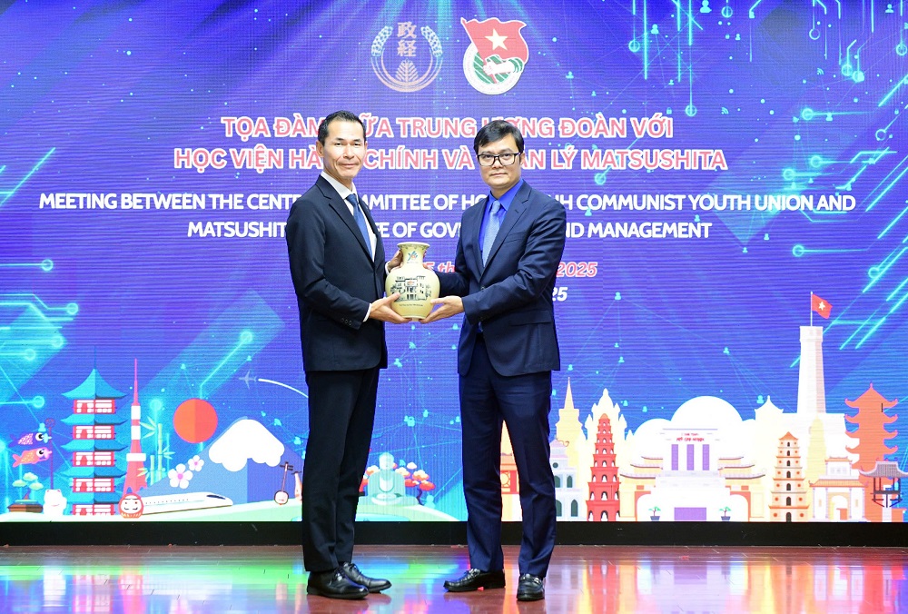 Đồng chí Bùi Quang Huy- Bí thư thứ nhất Trung ương Đoàn TNCS Hồ Chí Minh trao tặng quà lưu niệm cho ông Ozeki Kenji- Giám đốc Học viện Hành chính và Quản lý Matsushita