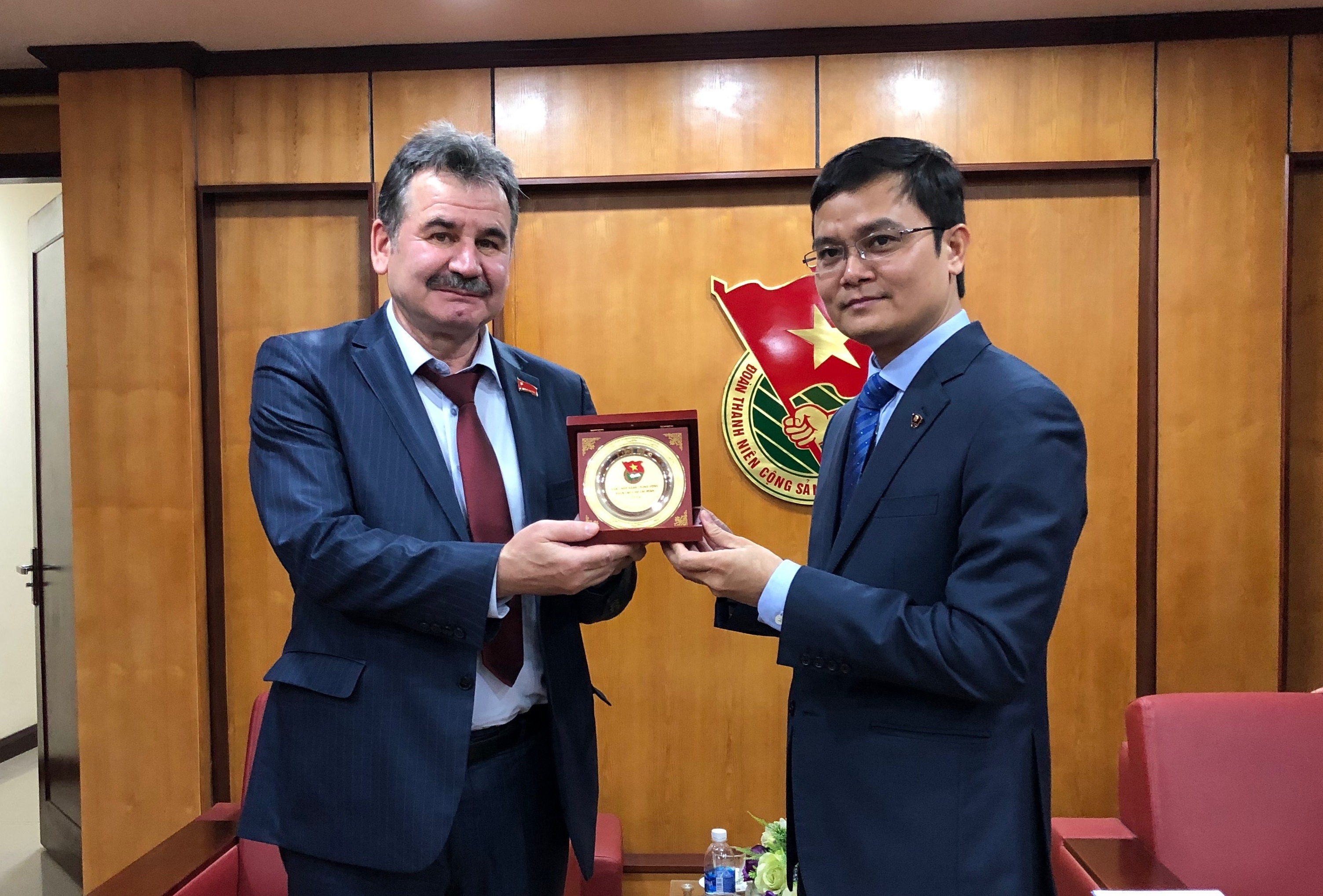 Bí thư Trung ương Đoàn Bùi Quang trao tặng biểu trưng Logo huy hiệu đoàn cho ngài Léc-ki Đmi-tri Mắc-xim-mô-vích - Bí thư Trung ương Đảng |