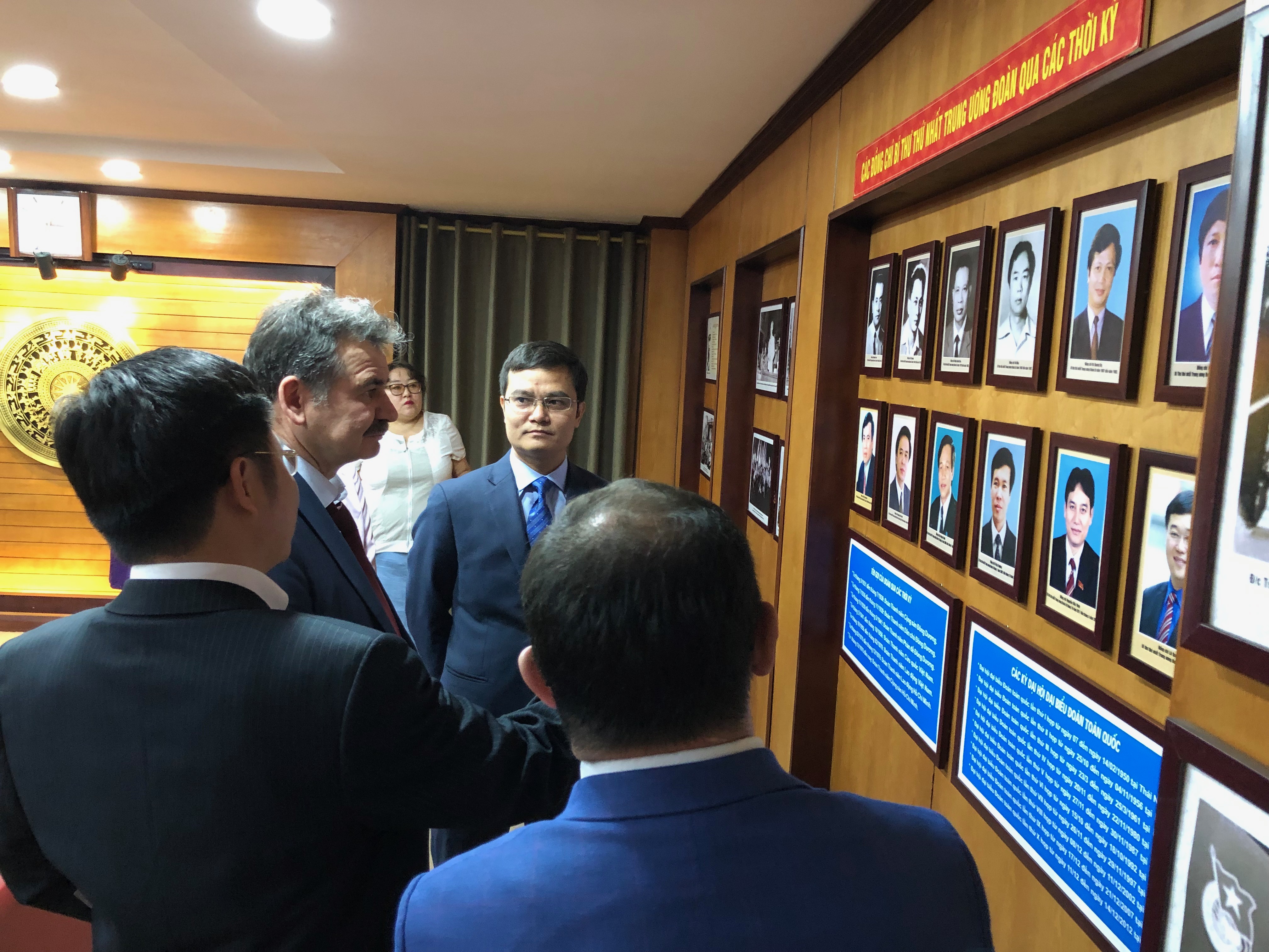 Đồng chí Bùi Quang Huy- Bí thư Trung ương Đoàn giới thiệu với đoàn công tác Đảng Cộng sản nhân Ca-dắc-xtan các đồng chí Bí thư thứ nhất Trung ương Đoàn TNCS Hồ Chí Minh qua các thời kỳ |