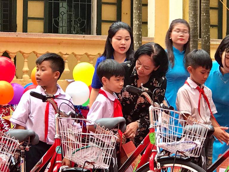 Đồng chí Trương Thị Mai, Ủy viên Bộ Chính trị, Bí thư Trung ương Đảng, Trưởng Ban Dân vận Trung ương; đồng chí Nguyễn Phước Lộc, Phó trưởng Ban Dân vận Trung ương; đồng chí Nguyễn Ngọc Lương, Bí thư T.Ư Đoàn, Chủ tịch Hội đồng Đội T.Ư trao tặng 60 suất học bổng, 11 chiếc xe đạp cho các em thiếu nhi có hoàn cảnh khó khăn là con em công nhân, nhân dân trên địa bàn