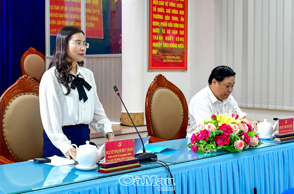 Đồng chí Nguyễn Phạm Duy Trang, Bí thư Trung ương Đoàn, Chủ tịch Hội đồng đội Trung ương đề nghị, tỉnh cần có sự phân công, phân kỳ rõ ràng cụ thể trong thực hiện Nghị quyết, cùng với đó tăng cường kiểm tra, giám sát việc thực hiện Nghị quyết tại cơ sở; quan tâm, tạo điều kiện cho thanh niên tham gia các chương trình phát triển kinh tế - xã hội, dành nguồn lực cho thanh niên khởi nghiệp; bố trí, sắp xếp, đào tạo nguồn cán bộ trẻ; phát triển nguồn nhân lực chất lượng cao; quan tâm đào tạo nghề cho thanh niên vùng nông thôn, vùng đồng bào dân tộc thiểu số và các đối tượng thanh niên yếu thế.