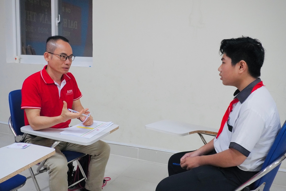 Các thí sinh Bảng B (khối Trung học cơ sở) tham gia dự thi phần thi Speaking trực tiếp với Ban giám khảo