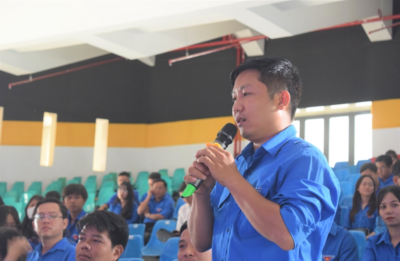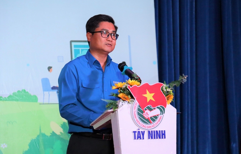 Đồng chí Nguyễn Thanh Tùng, Bí thư Tỉnh đoàn, Phó Trưởng Ban Chỉ đạo thực hiện Chương trình Phát triển thanh niên tỉnh phát biểu tại hội nghị
