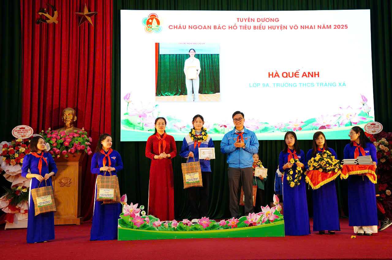 Đồng chí Hoàng Anh Đức, Phó Bí thư Tỉnh đoàn và đồng chí Bùi Thị Sen, Phó Bí thư Huyện ủy, Chủ tịch UBND huyện tuyên dương đại biểu cháu ngoan Bác Hồ huyện Võ Nhau năm 2025