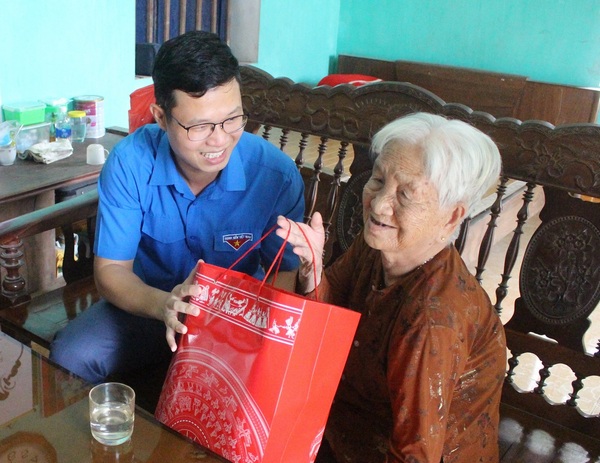 Đồng chí Thân Trung Kiên – Phó Bí thư Tỉnh đoàn tặng quà mẹ Việt Nam anh hùng Đồng Thị Nhâm - Xã Tam Hiệp, huyện Yên Thế
