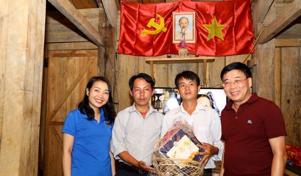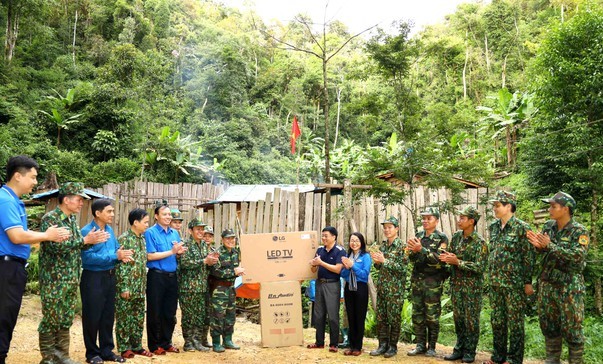 Đồng chí Nguyễn Văn Thông và đại diện Tỉnh đoàn tặng quà cán bộ, chiến sỹ Điểm chốt Nhọt Lợt