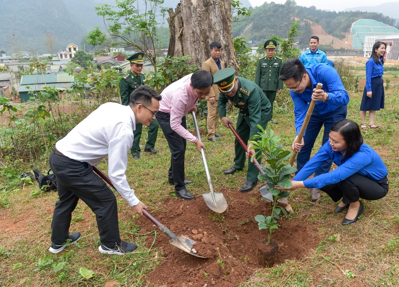 Trong khuôn khổ chương trình, Đoàn công tác cùng cán bộ, chiến sĩ Đồn Biên phòng Cửa khẩu Sóc Giang đã thực hiện nghi thức chào cờ và trồng 05 cây bưởi giống tại Cột mốc biên giới 651, xã Sóc Hà, huyện Hà Quảng.